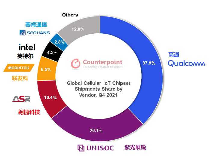 幾乎所有物聯(lián)網(wǎng)終端都需搭載IoT通信芯片,因而通信射頻芯片能夠直觀反映物聯(lián)網(wǎng)行業(yè)的成長周期與終端需求,堪稱行業(yè)風(fēng)向標(biāo)。在Counterpoint發(fā)布的全球蜂窩物聯(lián)網(wǎng)芯片追蹤報(bào)告中,高通、紫光展銳、翱捷科技、聯(lián)發(fā)科、英特爾、Sequans、華為海思等占據(jù)了大部分市場份額。