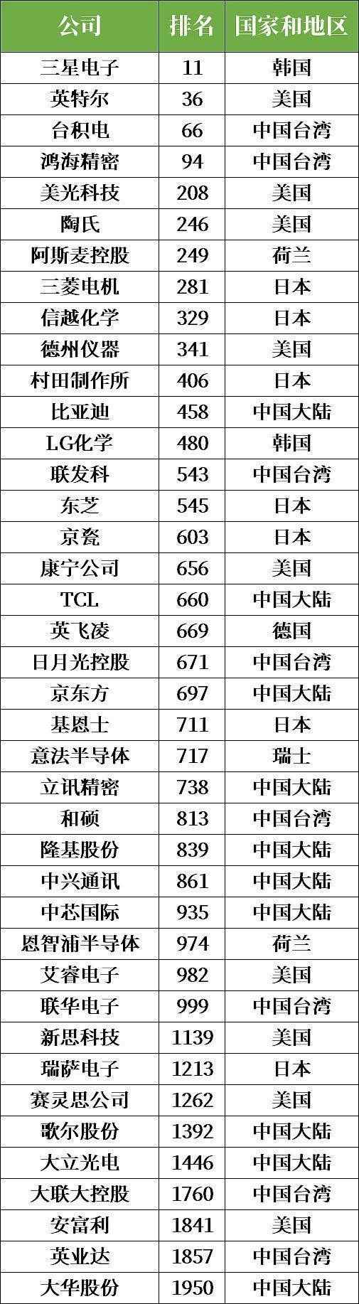據(jù)統(tǒng)計,2000強榜單中有41家半導(dǎo)體相關(guān)公司,其中包括中國大陸企業(yè)10家,中國臺灣企業(yè)9家。