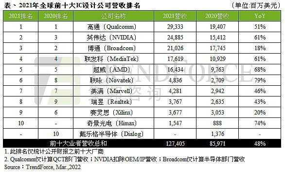 據(jù)TrendForce集邦咨詢研究顯示,2021年由于各類終端應(yīng)用需求強勁,導(dǎo)致晶圓缺貨,全球IC產(chǎn)業(yè)嚴重供不應(yīng)求,連帶使芯片價格上漲,拉抬2021年全球前十大IC設(shè)計業(yè)者營收至1,274億美元,年增48%。